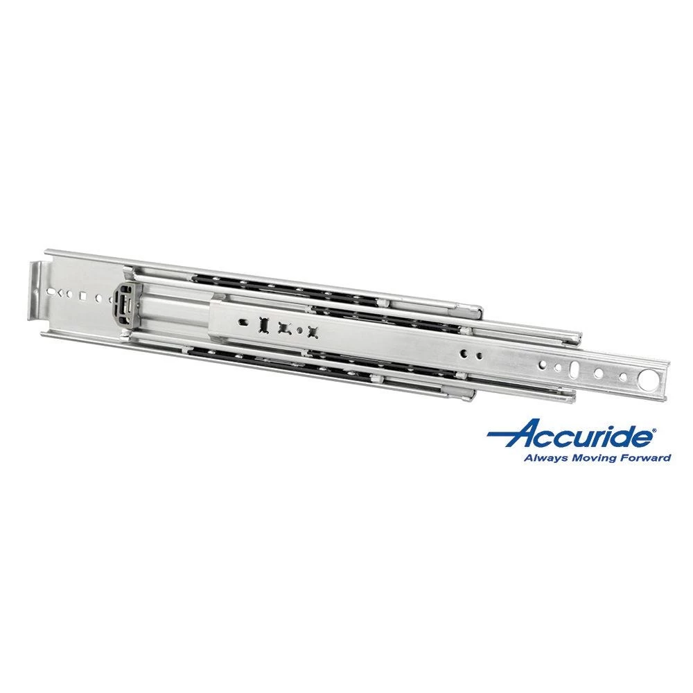 Tested for a total of 50,000 cycles at maximum load capacity, the 9301E drawer slides offer unfailing strength and reliability for a full breadth of heavy-duty storage needs. Accuride 9301E slides can support up to 600 pounds—ideal for pantry cabinets, large storage drawers, tool chests and more. Thick gauge steel in both the inner and outer members contributes to their strength, while shock-absorbing bumpers reduce noise. The bridged ball spacers minimize side-to-side play, and produce smoother, more consistent movement.