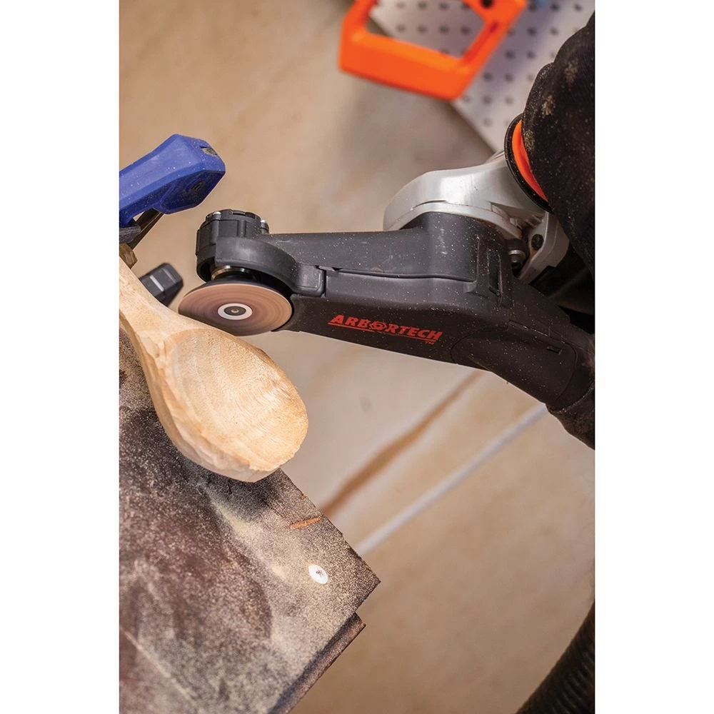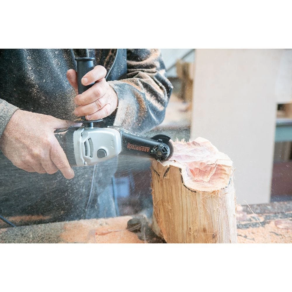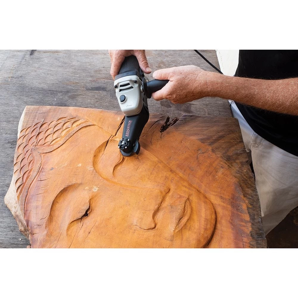 The long, narrow neck on the Arbortech Mini Carver provides unobstructed access to tight spaces, as well as superior visibility, since the motor housing does not obscure the blade. Ideal for detailed shaping, relief carving, grooving, planing, trimming and sanding. Features 6 speeds from 6,000 to 18,000 RPM, allowing you to adjust it for specific materials. Ergonomic grip makes it comfortable to operate for long periods. Vibration-reducing side handle can be installed for right- or left-handed users. Includes 2” diameter carbide-tipped carving blade, 15 heavy-duty sanding discs and carrying bag.