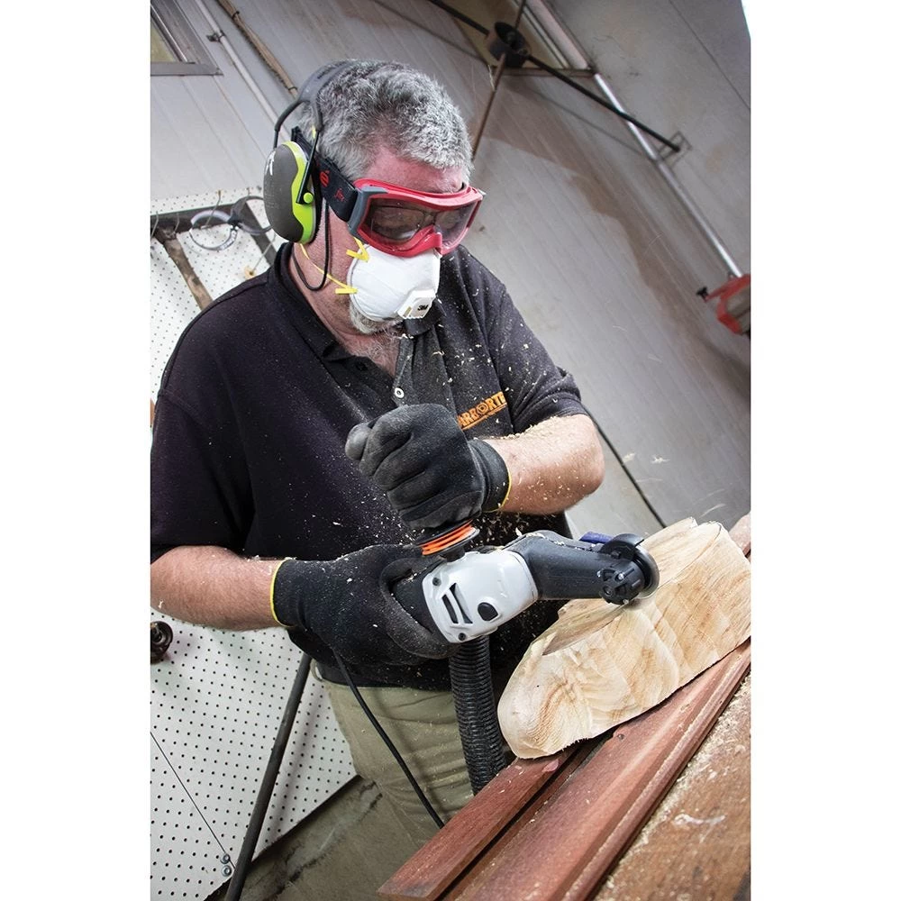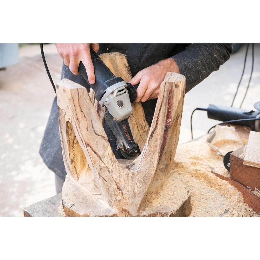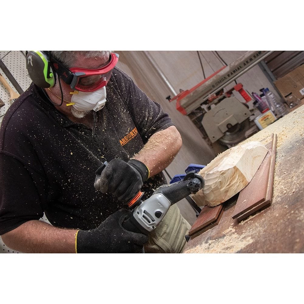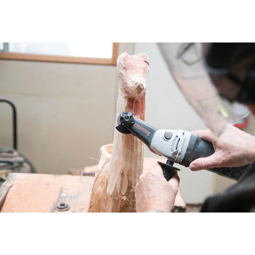 The long, narrow neck on the Arbortech Mini Carver provides unobstructed access to tight spaces, as well as superior visibility, since the motor housing does not obscure the blade. Ideal for detailed shaping, relief carving, grooving, planing, trimming and sanding. Features 6 speeds from 6,000 to 18,000 RPM, allowing you to adjust it for specific materials. Ergonomic grip makes it comfortable to operate for long periods. Vibration-reducing side handle can be installed for right- or left-handed users. Includes 2” diameter carbide-tipped carving blade, 15 heavy-duty sanding discs and carrying bag.