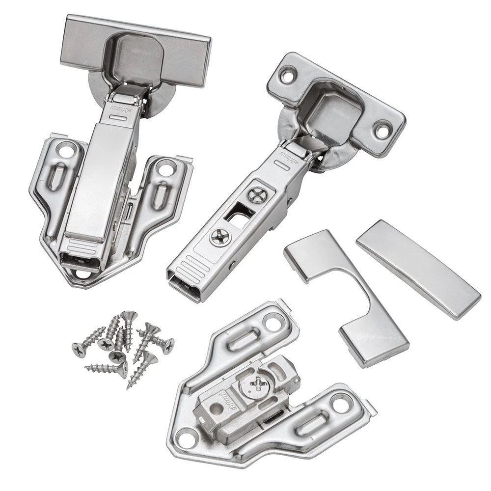 If your doors are thicker than the standard 3/4”, these are the hinges for you. They can handle doors from 3/4” up to 1-3/16” thick. The hinge travel is specifically designed to prevent the binding that would otherwise result from the additional thickness. In addition, they feature convenient three-way adjustability with easy height adjustments thanks to the parallel-movement mounting plate. Simply turn one screw for easy parallel height adjustments. No tools are required to mount and dismount the cabinet doors, and your adjustments remain in place even when you remove the door. Clip Top hinges include sleek metal caps to cover both the hinge arm and the cup mounting screws.
