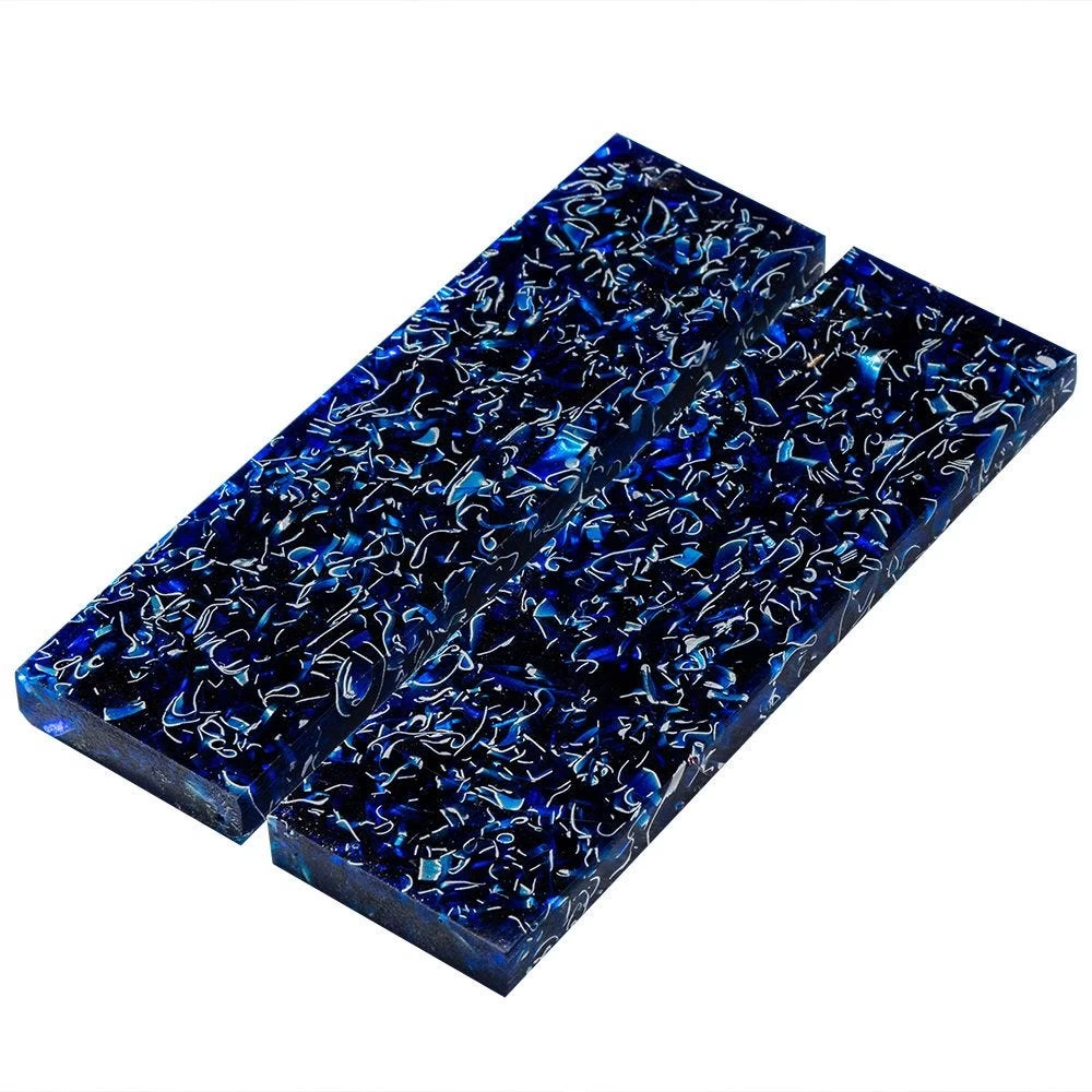 These knife scales are made from dyed resin impregnated with aluminum millings that give the finished product a shimmering appearance. The scales are cast and cured under a pressure/vacuum process. The resin shapes much like ordinary wood, is very durable, resistant to cracking or chipping, and finishes beautifully!