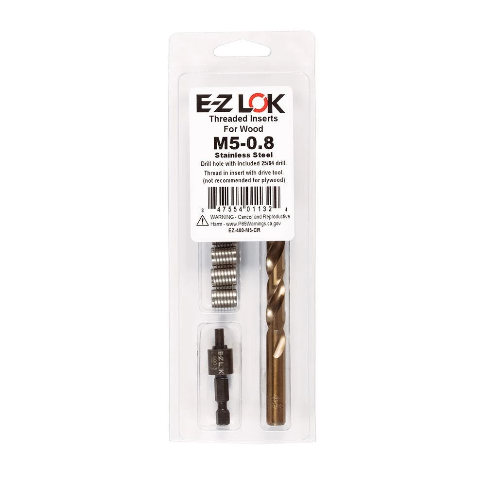 Everything you need to add strong, rigid machine threads to hardwoods in one convenient, easy-to-order kit. Also may be used to repair stripped holes where a wood screw was used previously. Kit includes a pack of threaded inserts, drill bit, and drive tool. Ideal for knock-down furniture or wherever you need a strong metal-reinforced joint in wood.