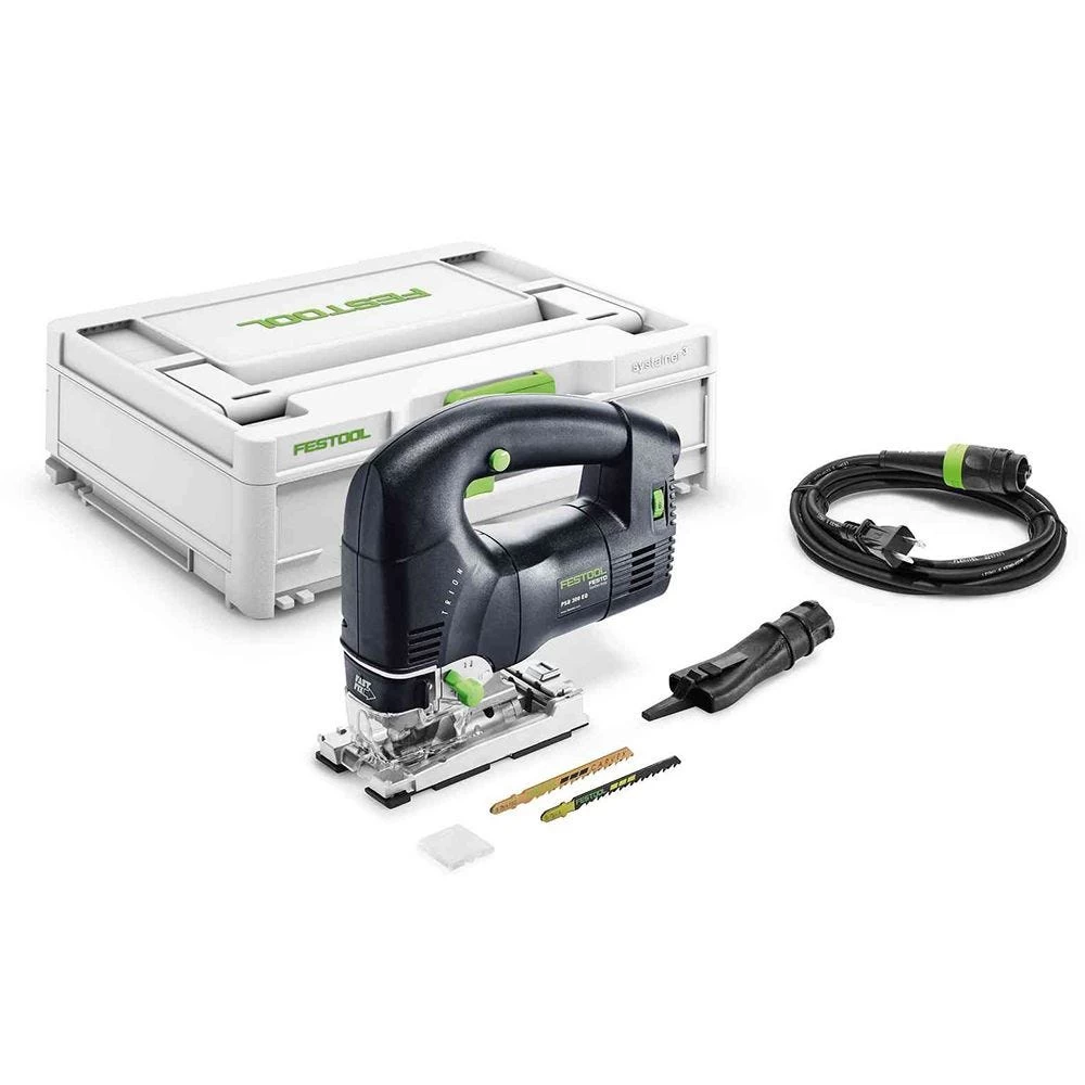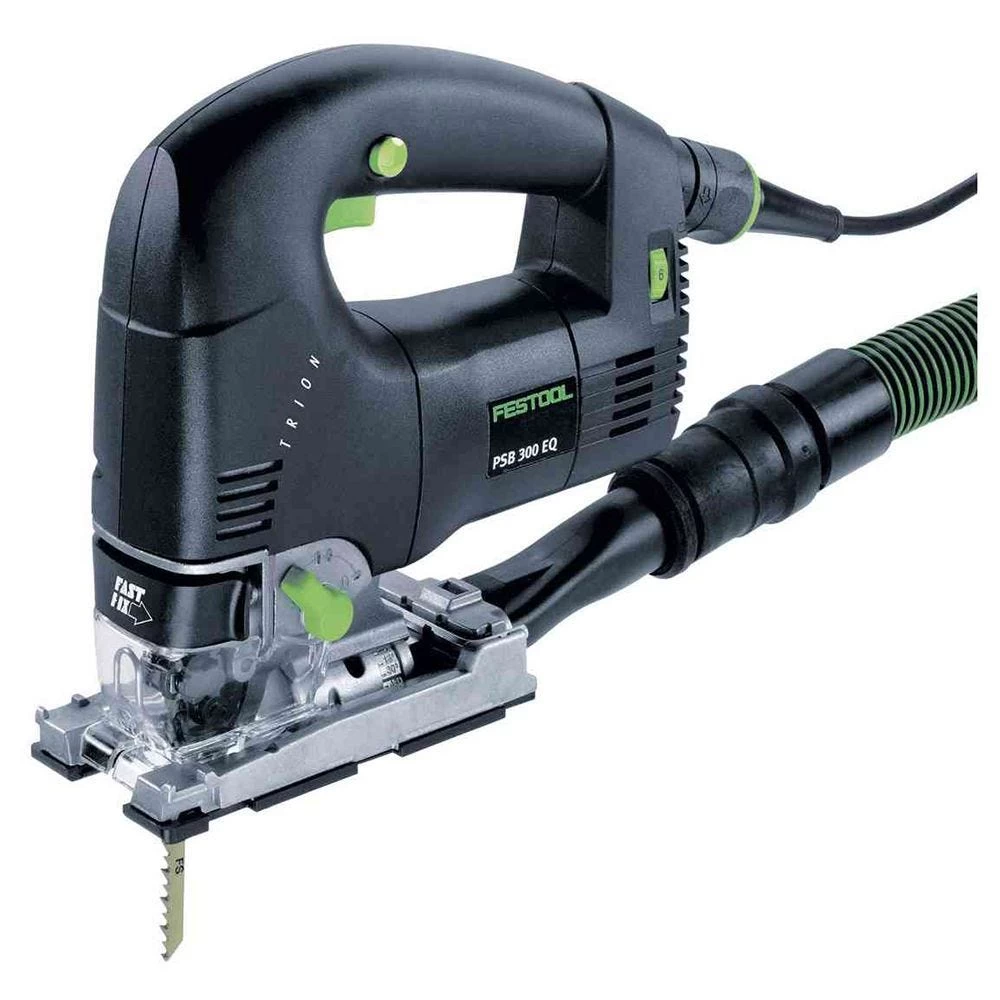 Trion jigsaws feature adjustable carbide-tipped jaws that work with the blade clamping system and back-up bearing to keep the blade perpendicular to the shoe at all times, even on curves. In addition, Trion jigsaws feature splinterguards that are designed to be cut by the blade for perfect zero-clearance between the blade and the splinterguard. The resultant cut is clean through the entire piece with little or no finishing required. The Festool PSB 300Â D-Handle Jigsaw features a finger tip trigger and smaller profile grip. The PSB 300 has all the qualities of the PS 300, with the addition of a comfortable D-handle for easy one-handed use.