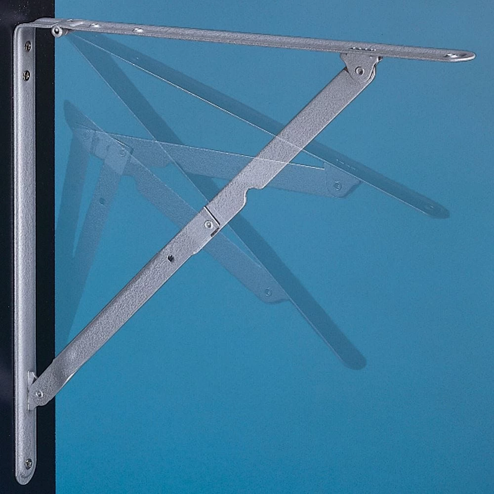 Enjoy the convenience of shelves that fold down when you no longer need them. Perfect for light duty shelving applications that require a low profile space, these folding brackets lock automatically in place when open. Made of heavy stamped steel with heavy rivet hinge points and baked enamel finish