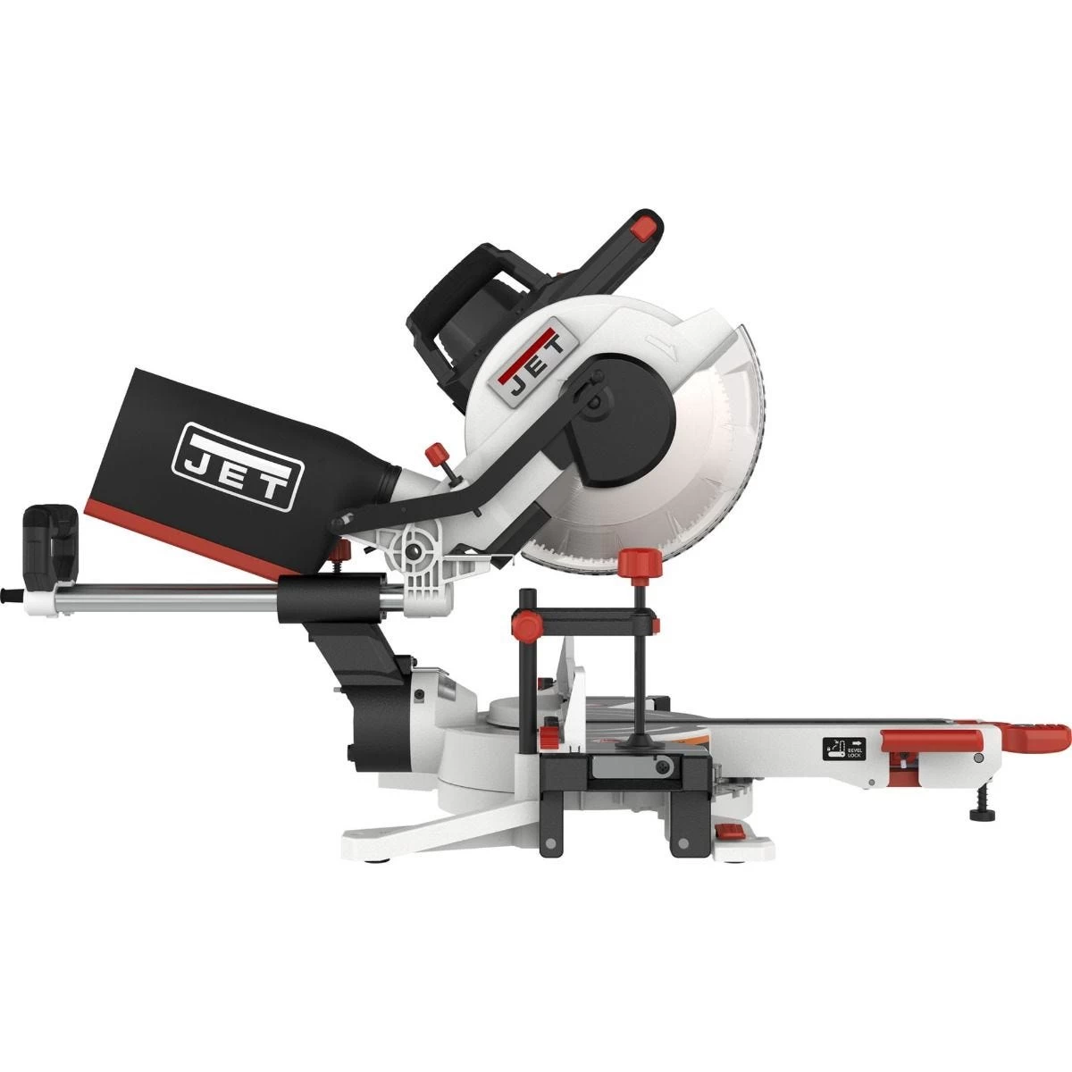 Jet’s 10” Dual-Bevel Sliding Compound Miter Saw represents excellent quality at an incredible price point. It features dual-bevel capability with a front-mounted thumb lever for convenient angle settings. Enclosed linear bearings provide smooth, controlled slide operation for crosscutting wide boards. The saw’s heavy-duty 15 amp motor and durable, die-cast aluminum construction ensure long life and excellent performance. A razor-thin, high-visibility red laser provides shows exactly where the kerf will land, while an LED light provides additional visibility in low light areas. The miter detent override function lets you make fine adjustments for tight-fitting miter joints.