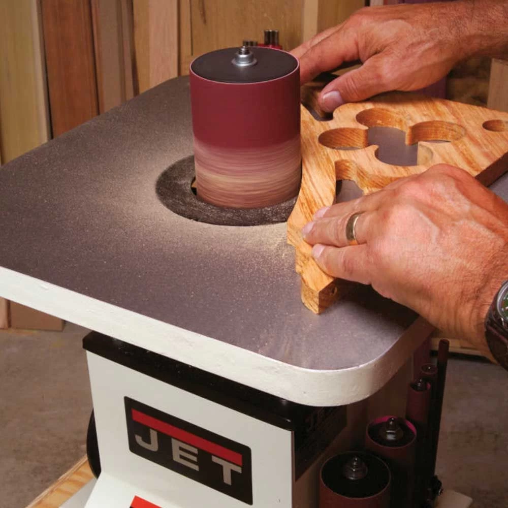 The JBOS-5 Benchtop Spindle Sander has a 1/2HP motor, and a large 14-1/2″ tilting table. A heavy-duty worm gear system provides one-inch oscillating action, which prolongs sleeve life and helps prevent burnishing of the workpiece. Four inserts are provided, and 5 spindles with sanding sleeves.