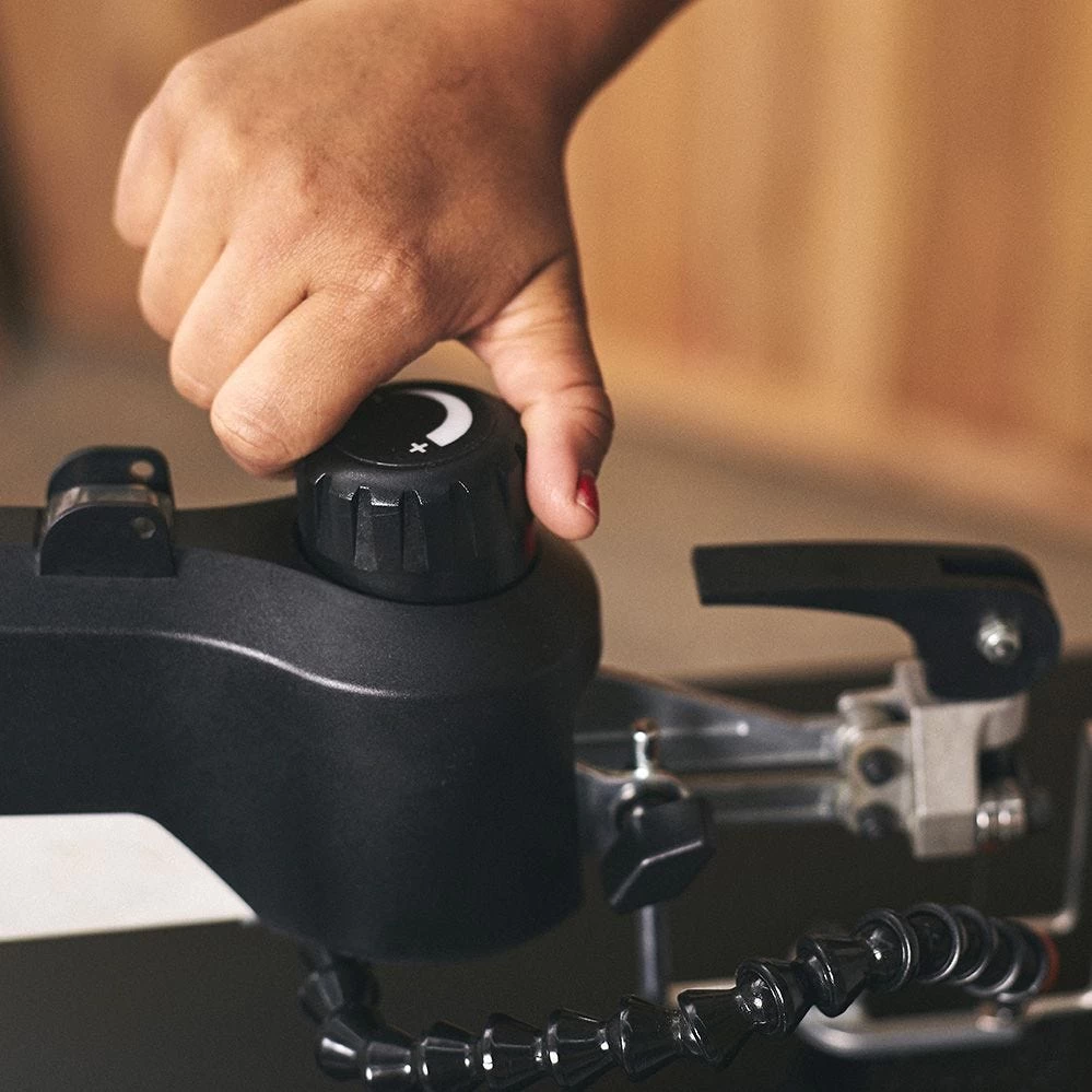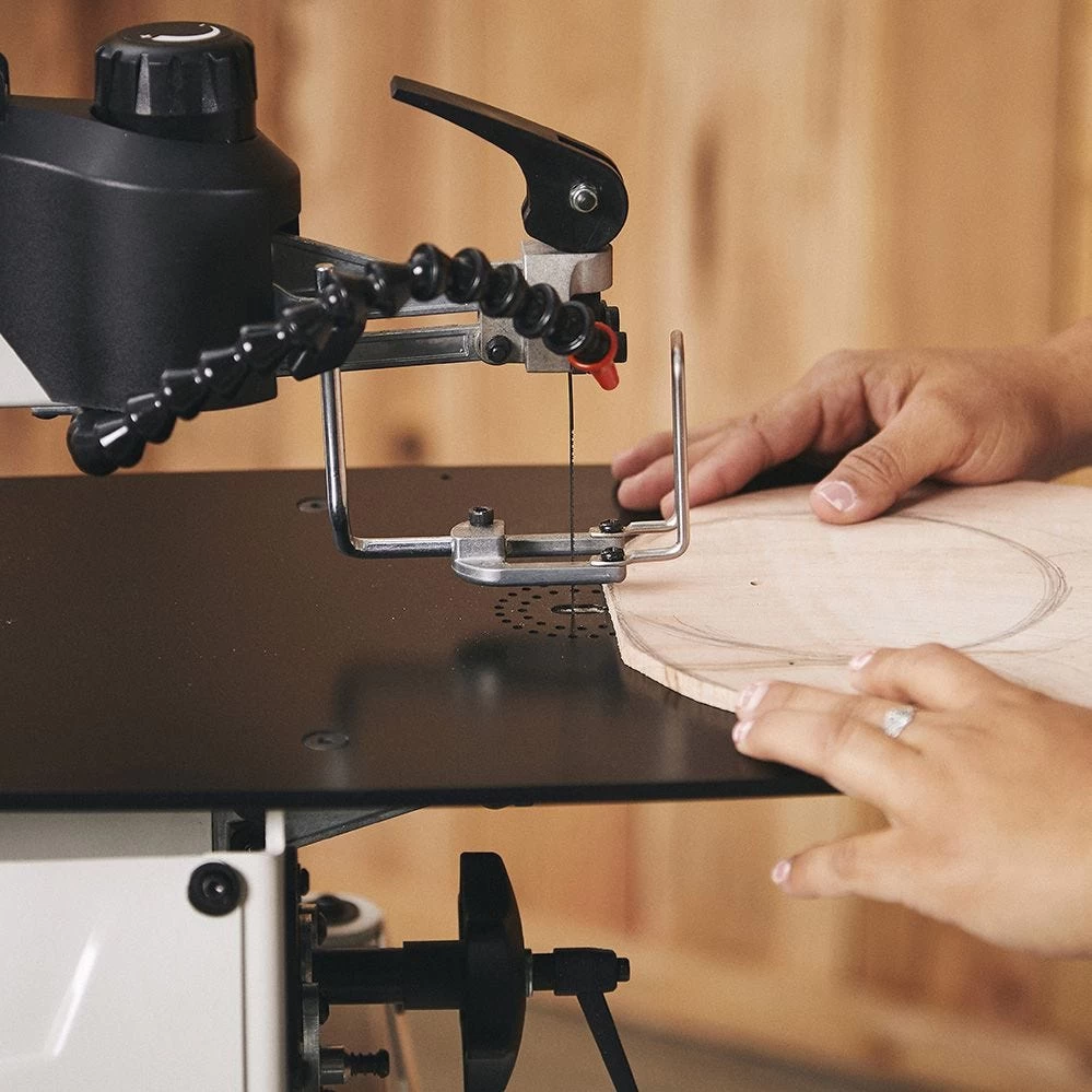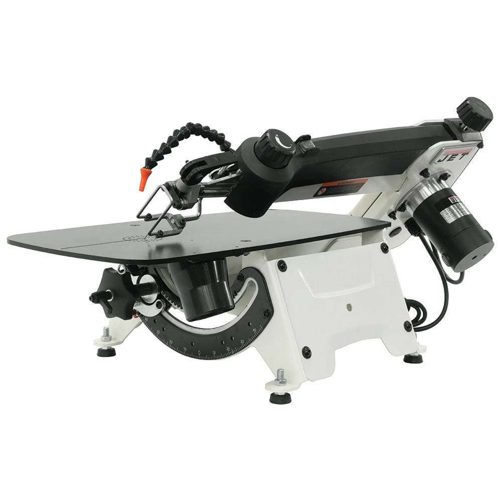 JET’s JWSS-18B 18” Scroll Saw features an exclusive blade change mechanism that combines blade clamping and tensioning into one simple step. The saw’s precision-ground, steel table measures 11-5/8” x 21”, providing a stable work surface that also helps to dampen vibration. With 18” of throat capacity and the ability to cut material up to 2” thick, there’s ample capacity for large workpieces. The top-lift, spring-loaded arm raises 10” and stays up until pulled back down. The table remains flat while the arm tilts 45° right and 30° left, resulting in comfortable sawing with the workpiece parallel to the floor. Dust and chips are collected at the source with the removable, 1-1/2” O.D. dust port. An integrated blower helps to clear the cutting area and increase cutline visibility.