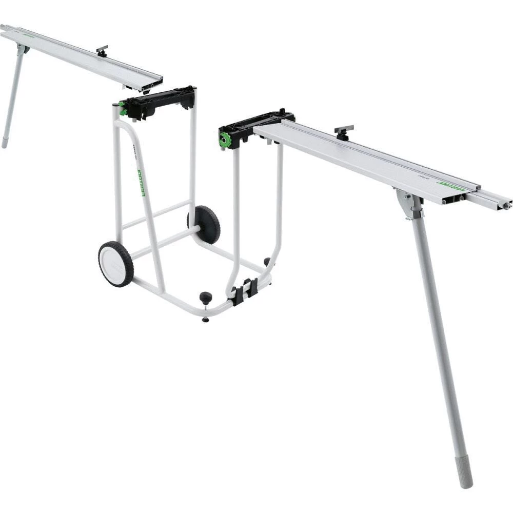 The Festool Kapex UG Stand provides a stable, comfortable foundation for your Kapex Miter Saw (sold separately). Thanks to its folding design and smooth-rolling wheels, it allows precise and efficient material processing on the jobsite or in the shop. Designed for fast and simple setup and breakdown, the UG stand is built for maximum mobility. It folds down with the saw still attached, and the included folding extension wings (left and right) are stowed onboard for easy transport and storage. The extension wings include a flip stop, imperial measurement scales and adjustable legs for leveling with the saw. The telescoping wings can be extended from 58-1/4” (1480 mm) to 94-1/2” (2400 mm) when needed.
