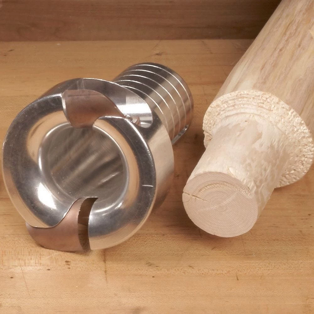 These state-of-the-craft cutters produce perfect tenons with radius shoulder profiles for the sturdiest-possible log furniture construction. The self-centering design ensures flawlessly shaped tenons, and dual precision-ground blades cut twice as fast as single blade models and stay sharp longer. Plus, as part of the cutters’ exclusive “IN-SIGHT” visual measurement system, slots along the shaft combine with radial grooves at 1/2″ intervals to let you to see your progress and measure tenon length while you cut. Body is CNC machined from aircraft aluminum for maximum strength and minimum weight. Available in four sizes (1/2″, 1″, 1-1/2″, and 2″) corresponding to the diameter tenon that each will cut.