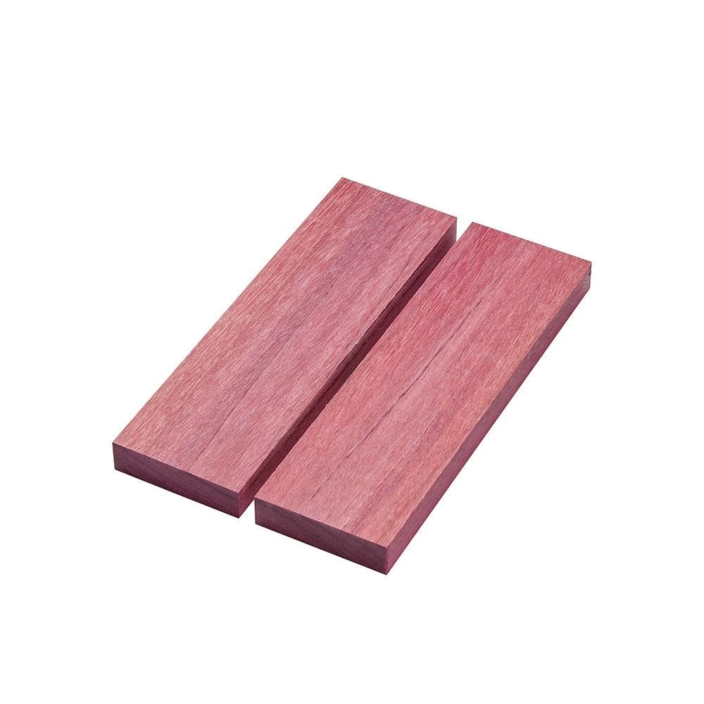 Aptly named for its purplish heartwood, purpleheart has become a favorite for woodworkers looking for both color and strength. These purpleheart knife blanks provide excellent strength, rot resistance, and a solid feel in your hand. The color is dull when freshly cut, brightens over a period of days to a deep purple, and darkens to a purplish brown in the long term. Color changes can be slowed with the use of UV-inhibiting finishes. Use sharp tools and take care not to overheat cutters.