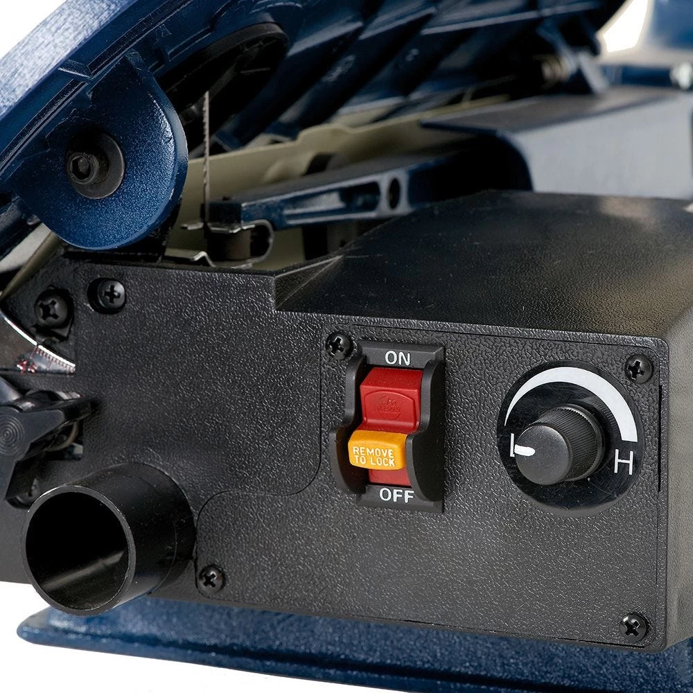For fine detail work at a great price, it’s hard to beat the Rikon 10-600VS Variable Speed Scroll Saw. The saw accepts both pinned and pinless blades, and the speed can be varied from 550 to 1650 strokes per minute to suit the wood species, thickness and cutting radius. Maximum cutting capacity is a whopping 2” thick, and the saw has a 15-3/4” throat depth. The included flexible work lamp provides good visibility, and allows you to move the lamp as needed to eliminate shadows. The saw even includes a power takeoff port for attaching an optional flex shaft multi-tool—great for cleaning up edges after you’ve finished sawing.