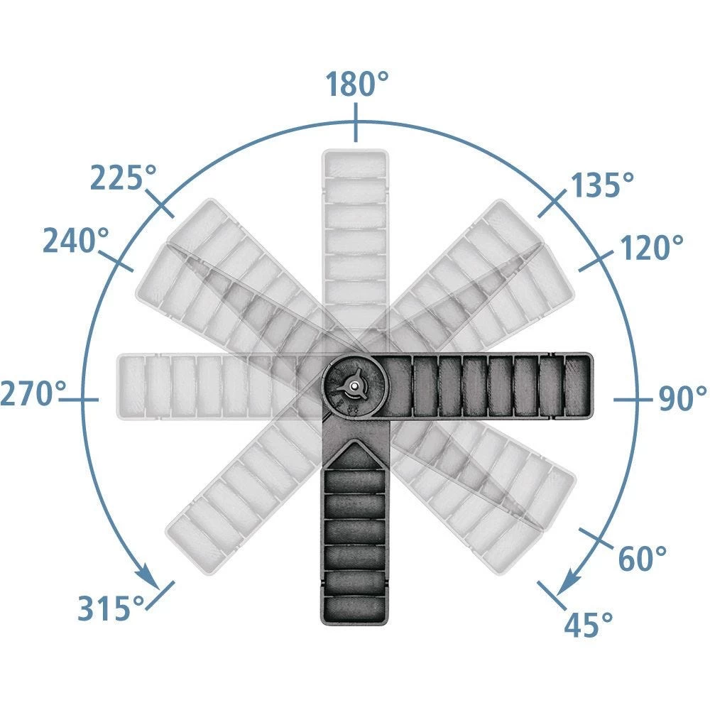 - Locks at 90°, 45°, 60° and multiples of 45° and 60°—interlocking teeth securely set the angle
