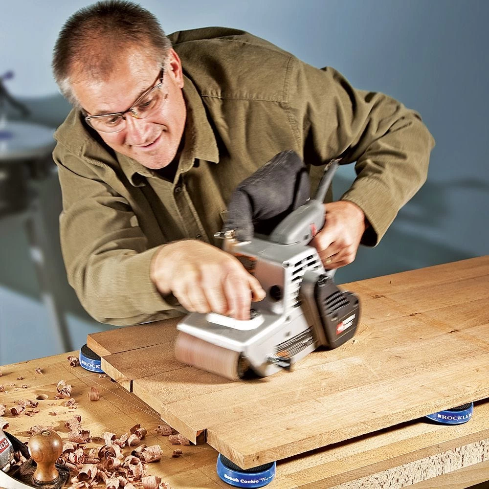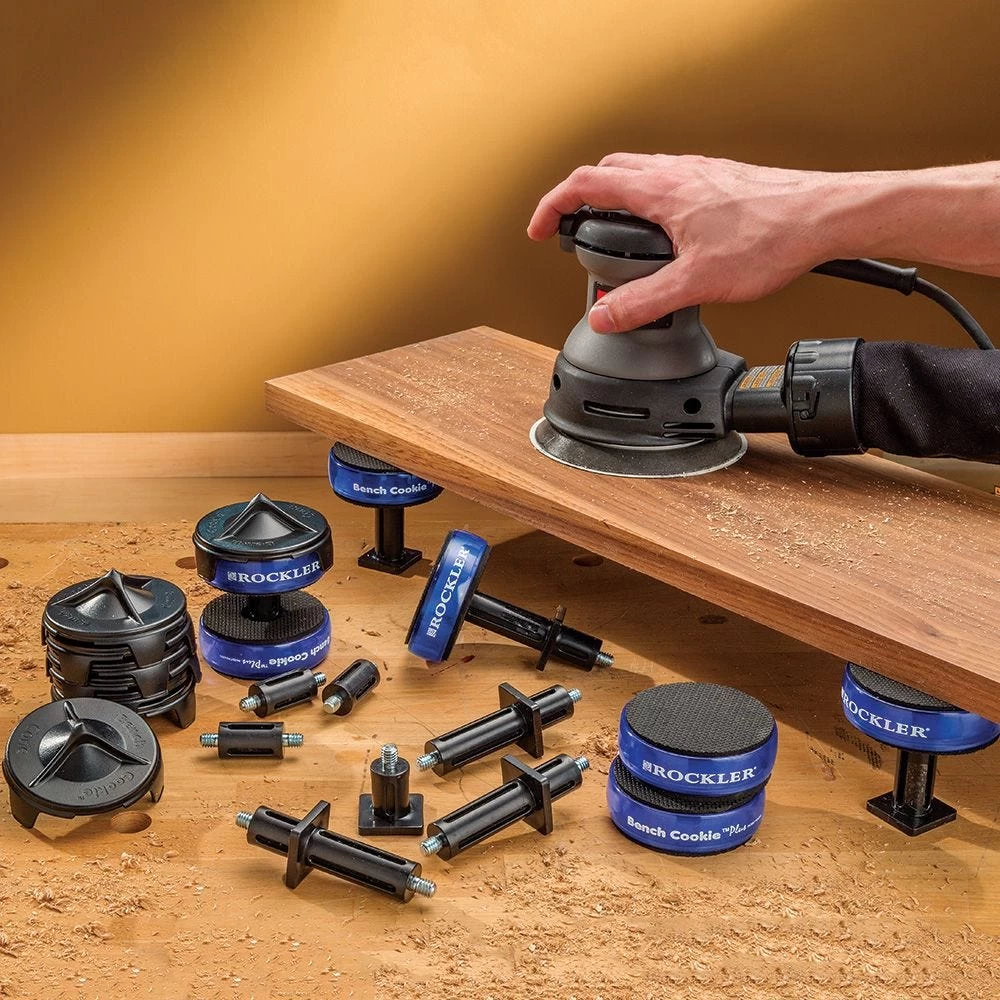 This deluxe assortment brings the full power of the Bench Cookie® system to your shop. Use the Work Grippers alone on the bench to keep your work from sliding around and getting scratched, or pair them with the included standard risers and XL risers and slip them into dog holes for even more stability. The XL risers can be used at two heights to allow clearance underneath for bits and blades, while the eight included Finishing Cones snap over the Bench Cookies to provide the perfect perch for your finishing projects.