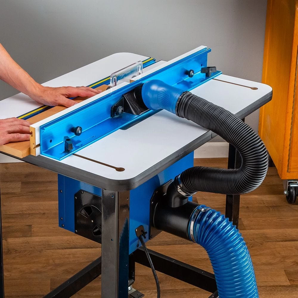 This ingenious accessory does double-duty as both a cleanup brush and the hose to the dust port on your fence. Just pull it off the port to clean up stray dust and chips that collect on your router table or drill press. No need to pull out the shop vacuumāthe included hose expands in length up to 50” so you can reach all parts of even the largest tops. The swiveling port ensures that the hose doesn’t get tangled, while durable reinforced ABS construction ensures durability in a busy shop.
