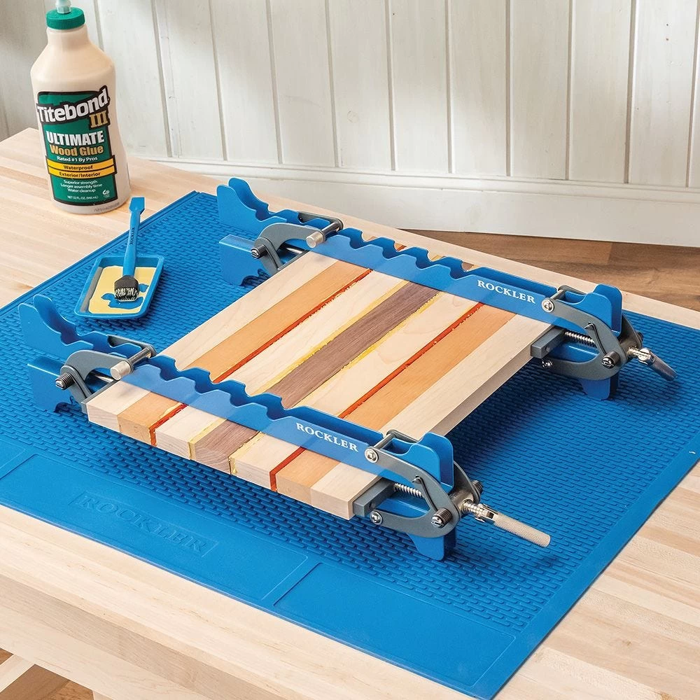 - Powerful four-way pressure clamps boards being edge glued to form a perfectly flat panel—no more bowing!