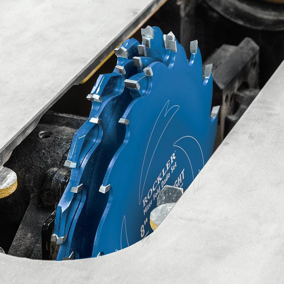 Note: Table saw must be capable of running an 8” dado stack. Some saws may require a thinner arbor nut/flange to cut miter folds in 3/4” material. Not compatible with SawStop or any other saws equipped with flesh-detection technology. Specially profiled blade is compatible with the included dado set only.
