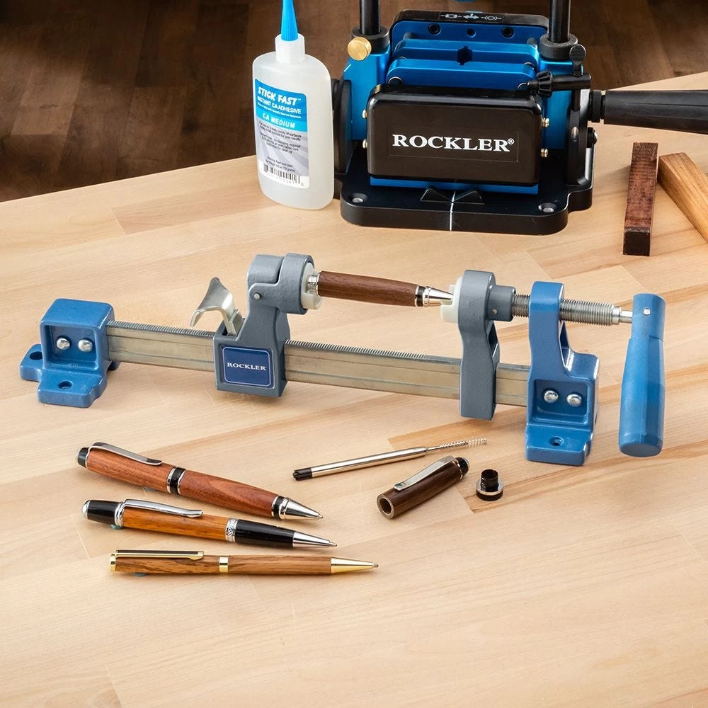 Precision threads and rigid, linear action make the Rockler® Pen Press a pleasure to use for pressing pen parts together. With a quick-action clutch and sturdy build to minimize deflection under pressure, it works much like a miniature bar clamp. Nylon caps with center indents keep your pen perfectly positioned, and prevent any marring to the finish on your parts. The feet provide a stable, compact footprint, and holes let you mount it to a piece of plywood for further stability if desired.