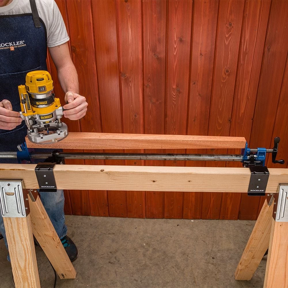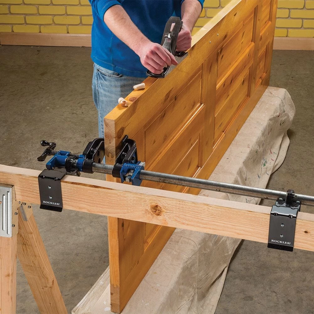 These brackets can slip over the 2×4 crossbeam on a sawhorse to make a quick on-site vise for holding and clamping a wide variety of items. The brackets swing open to accept a standard 3/4” pipe clamp, then slide easily over the 2x material to anchor the vise in place. They are held in place via friction and gravity, and you can use the included screws for additional stability. When in use, the clamps can be positioned in the upright position, and then swung out of the way when not needed, or when you wish to use the sawhorses in the traditional way. The brackets hold 3/4” I.D. pipe in a ring clamp that is fitted with a rubber gasket for a better grip. The ring clamp is tightened with a tool-free thumb screw.