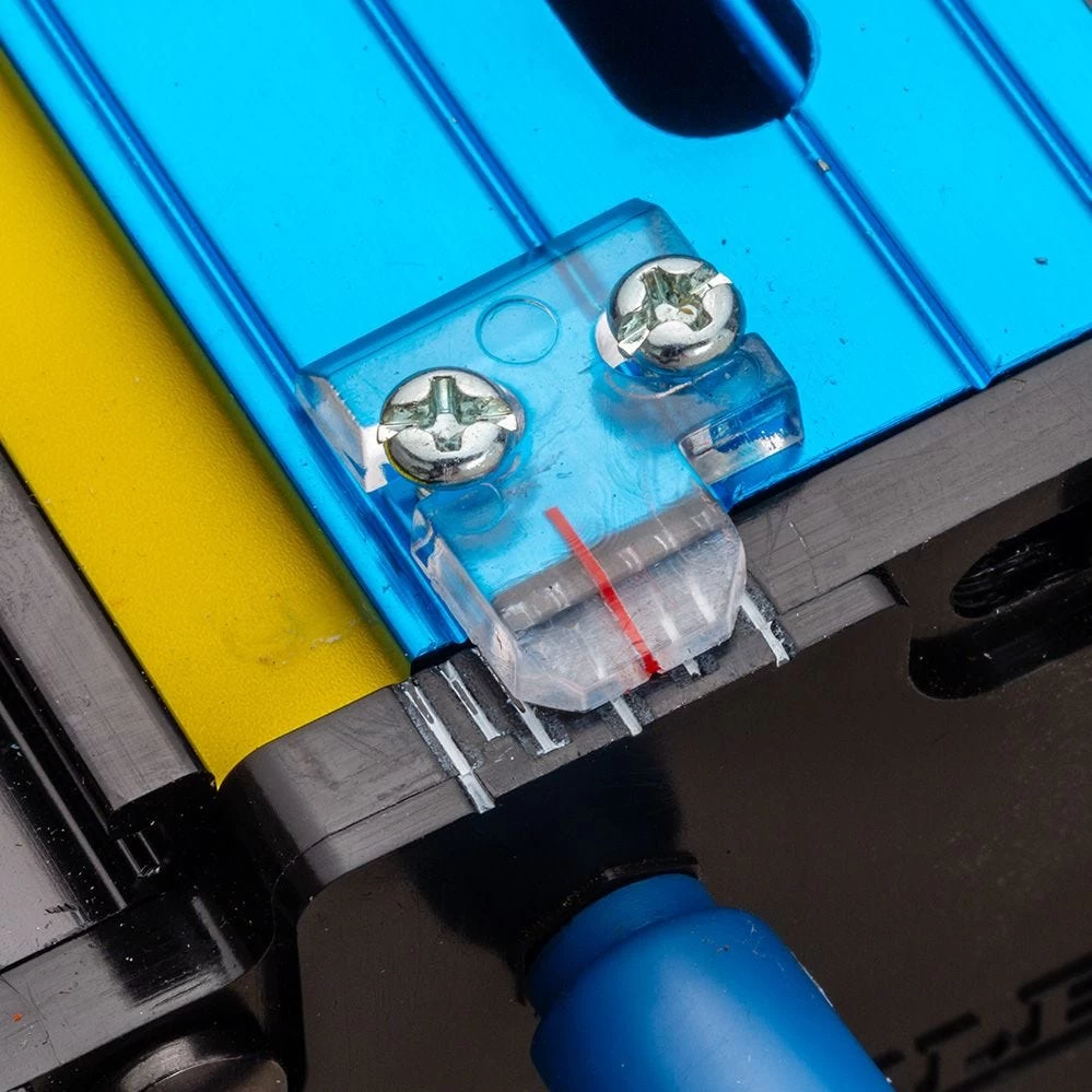 - Hinge mechanism on outfeed end allows micro-adjustment in or out with the turn of a knob
