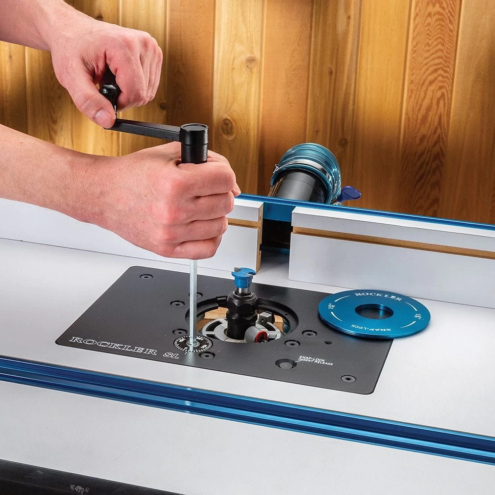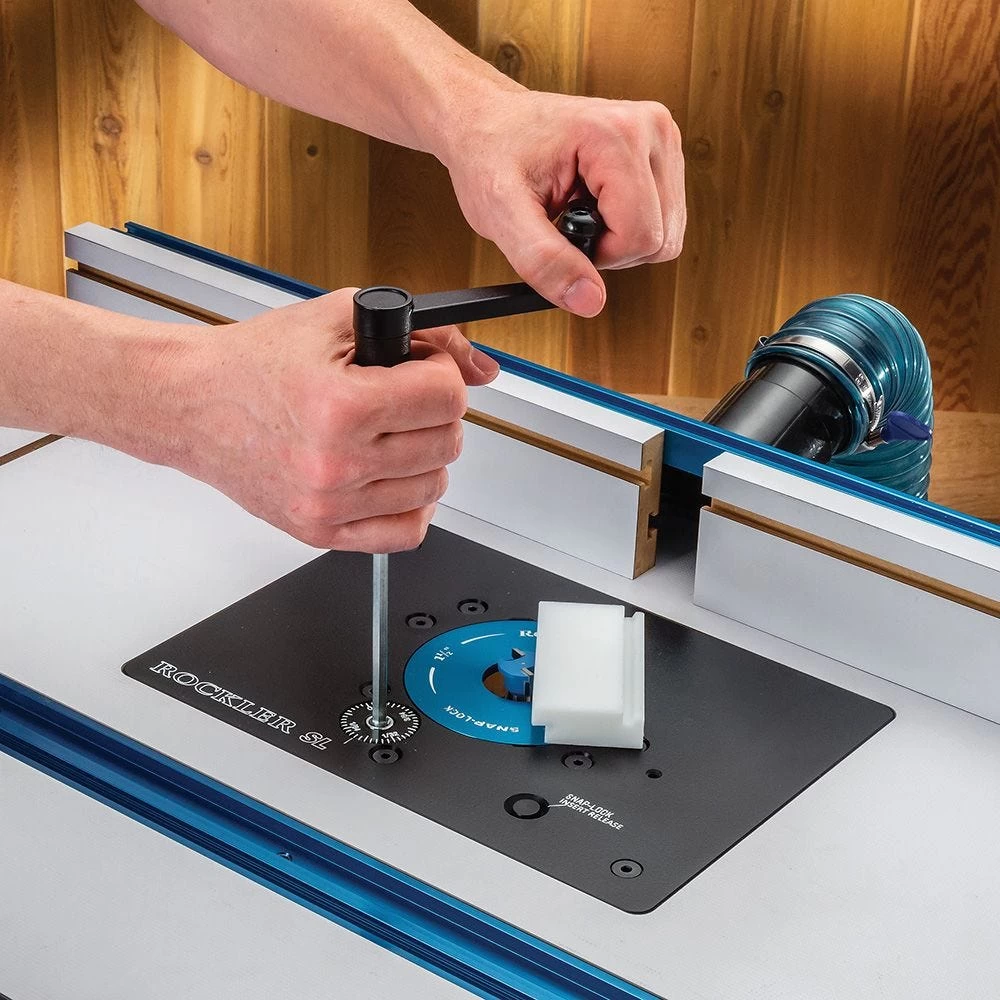 For woodworkers looking for an affordable mid-sized router lift with solid performance and features, the Rockler Snap-Lock Router Lift rises to the top. It satisfies the basic requirements of a good router lift: a flat, low-friction plate and smooth lifting action for comfortable, aboveboard bit height adjustments. Add to that our much-loved Snap-Lock insert ring system, which lets you change rings with the push of a button. This means you can quickly raise the router to its highest point for easy, above-table bit changes, without having to search for tools or remove screws to get the insert ring out.