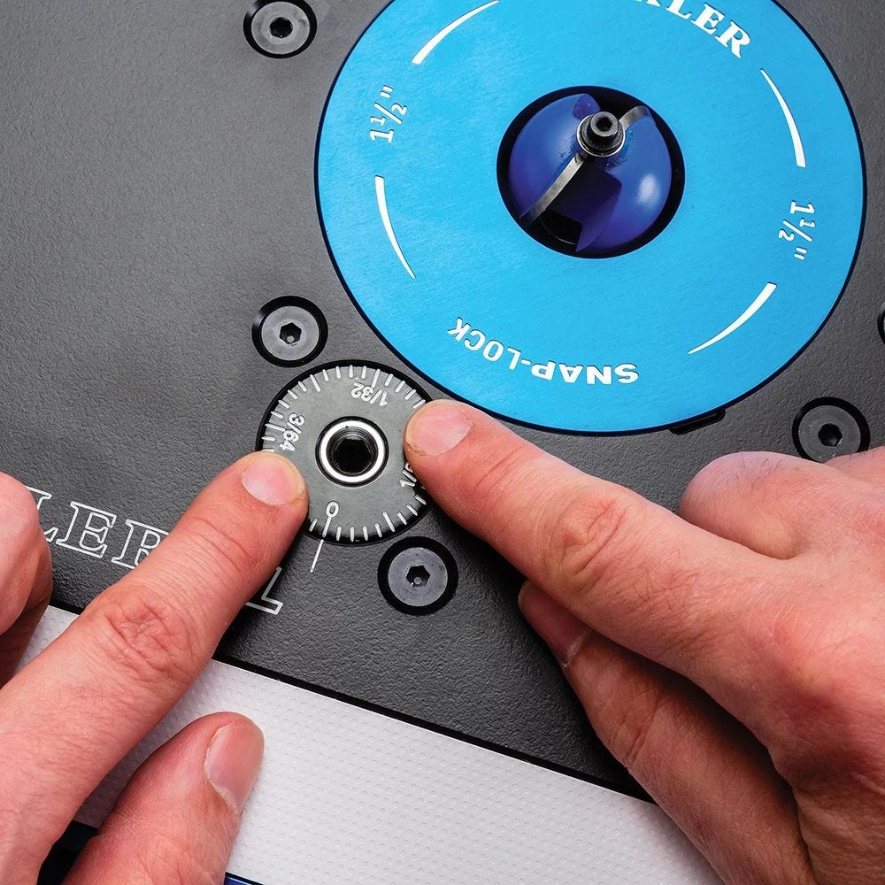 - Adjust bit height and change bits easily and comfortably from above the router table